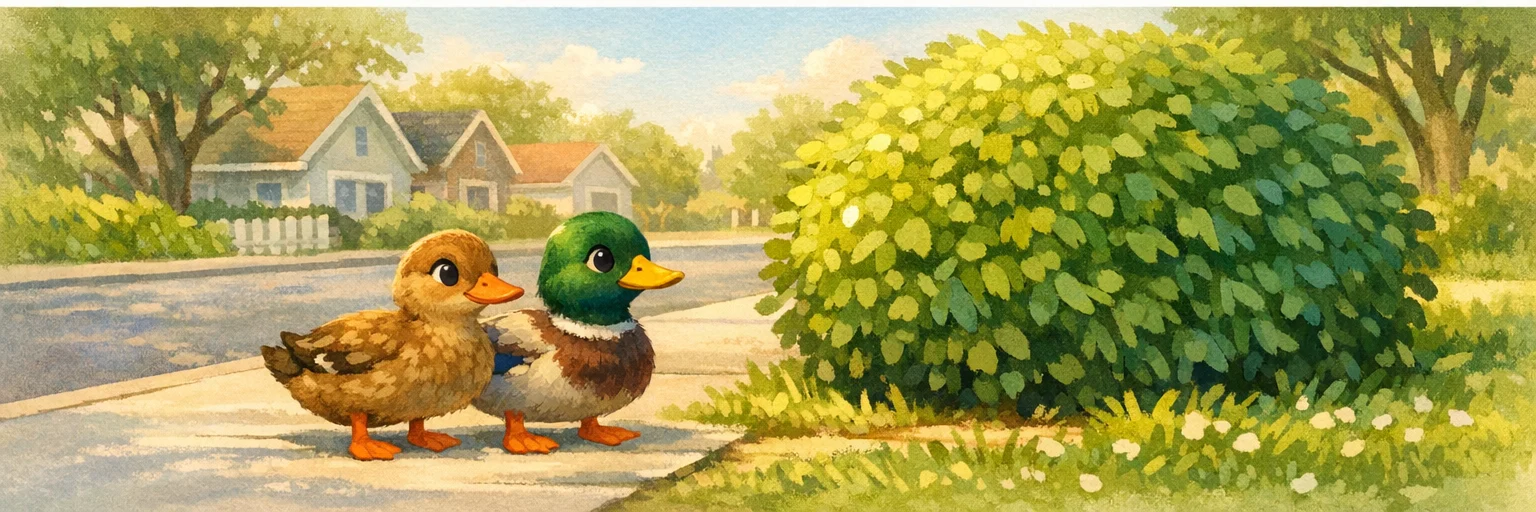 At the edge of the lawn, Daisy saw a big round bush with soft leaves. Henry stopped beside her. The world felt big, but the ducks felt brave.