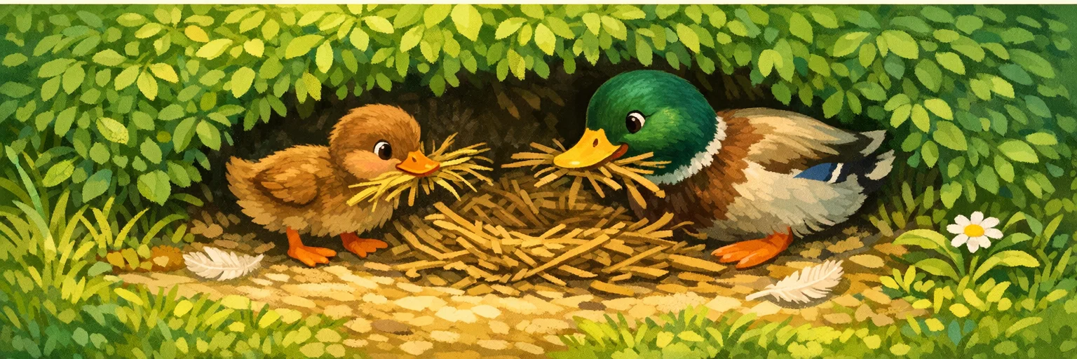 The neighborhood was warm and safe. The ducks were busy and happy, making their nest just right.