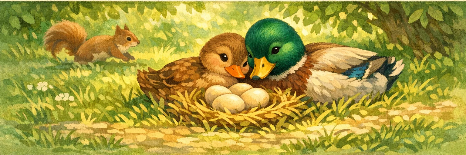 Daisy listened to Henry. She heard children laughing far away. She heard a soft breeze moving through the leaves. "I hope our eggs will be safe," Daisy said softly. She looked at the round eggs nestled in the grass.