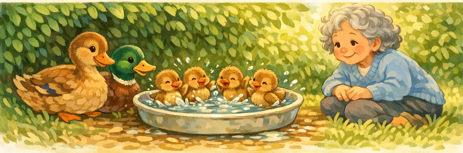 Mrs. Green stood at the edge, her curly gray hair glowing in the light. She wore her soft blue sweater and smiled warmly. Sometimes she tossed bits of tasty bread to the ducklings. The neighbors watched too, waving and cheering as the ducklings learned to swim.