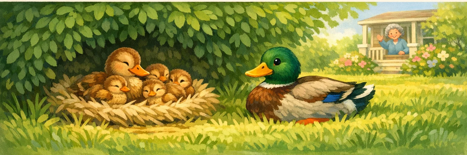 The ducklings chirped and played. They waddled under the bush, bumping into soft leaves. Daisy smiled. Henry quacked softly to keep everyone together.