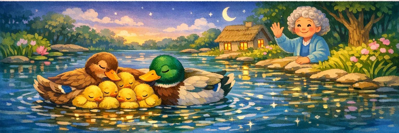 As the sun began to set, Daisy tucked her ducklings close. Henry settled beside them. The family snuggled together, warm and safe in their new home. Mrs. Green waved goodnight. The water sparkled, and all was calm.